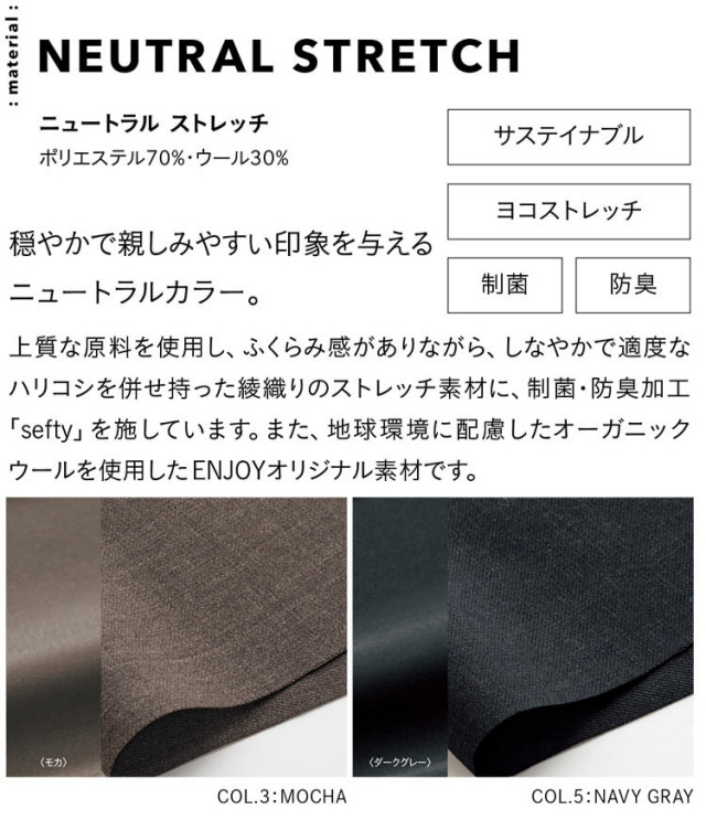 デスクワークがラクにキレイ見え、みんなに優しい制菌穏やかで・防臭スーツです。穏やかで親しみやすい印象を与えるニュートラルカラーです。上質な原料を使用し、ふくらみ感がありながら、しなやかで適度なハリコシを併せ持った綾織りのストレッチ素材に、制菌・防臭加工「sefty」を施しています。また、地球環境に配慮したオーガニックウールを使用したENJOYオリジナル素材です。