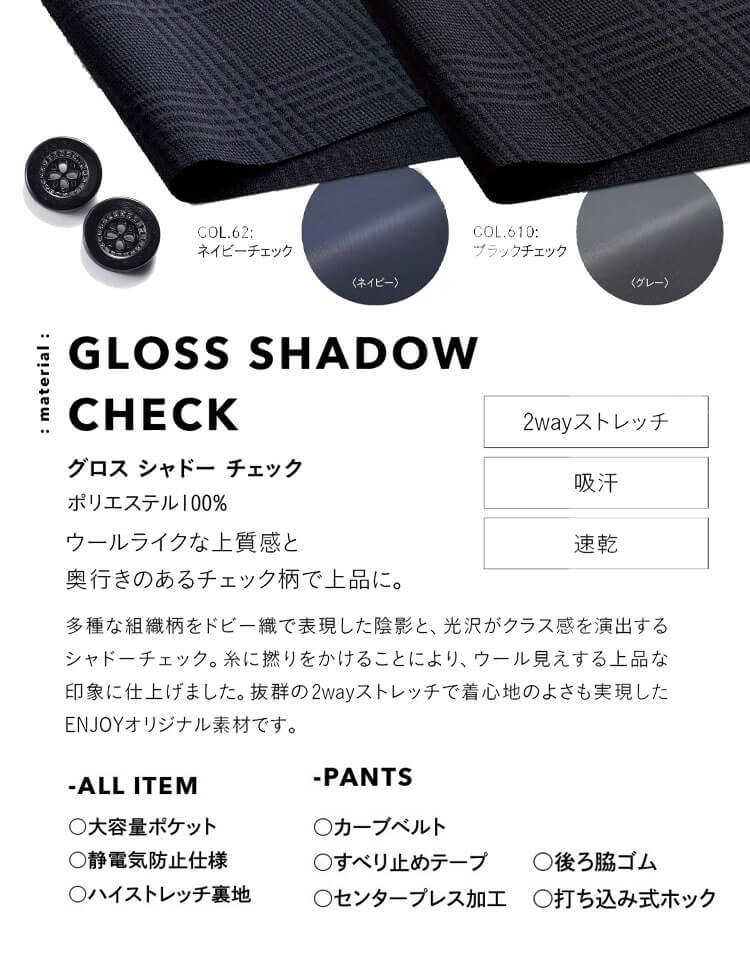 360°どこから見ても美しく、それでいてきゅうくつ感のない着心地を叶えた「美スラッとBEYOND」がデビューです。 多面体でつくり出すスリムなボディラインと、伸びのよい2wayストレッチの生地を合わせることで細見えと抜群の着心地を実現しました。 スタイリッシュなシャドーチェック柄を使用したどんなときも美しく、伸びてフィットする。「美スラッと」のシリーズです。多種な組織柄をドビー織りで表現した陰影感と、光沢感がクラス感を演出するシャドーチェックです。糸を撚糸することにより、ウール見えする上品な印象に仕上げました。抜群の2wayストレッチで着心地の良さも実現したENJOYオリジナル素材です。