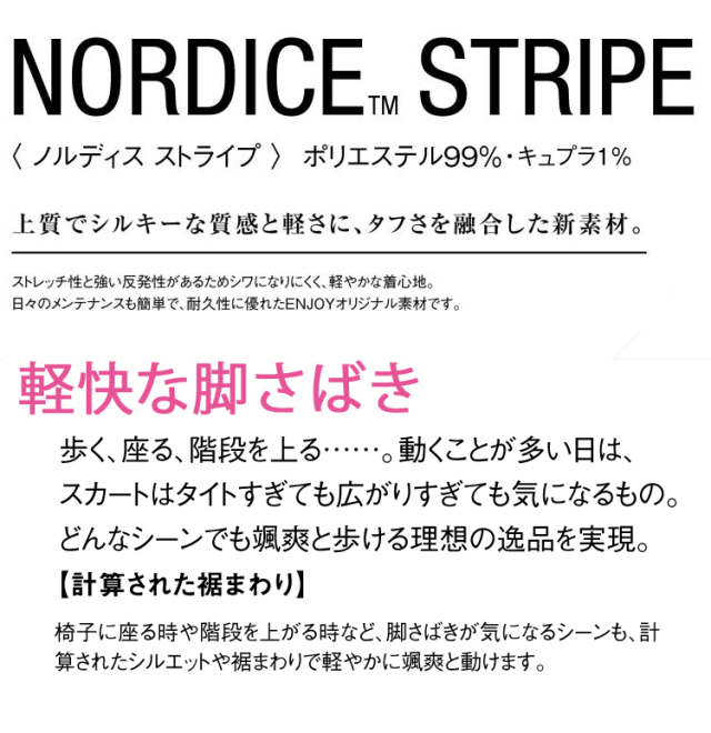上質でシルキーな質感と軽さに、タフさ融合した素材。ストレッチ性と強い反発性があるためシワになりにくく、軽やかな着心地。日々のメンテナンスも簡単で、耐久性に優れたENJOYオリジナル素材です。