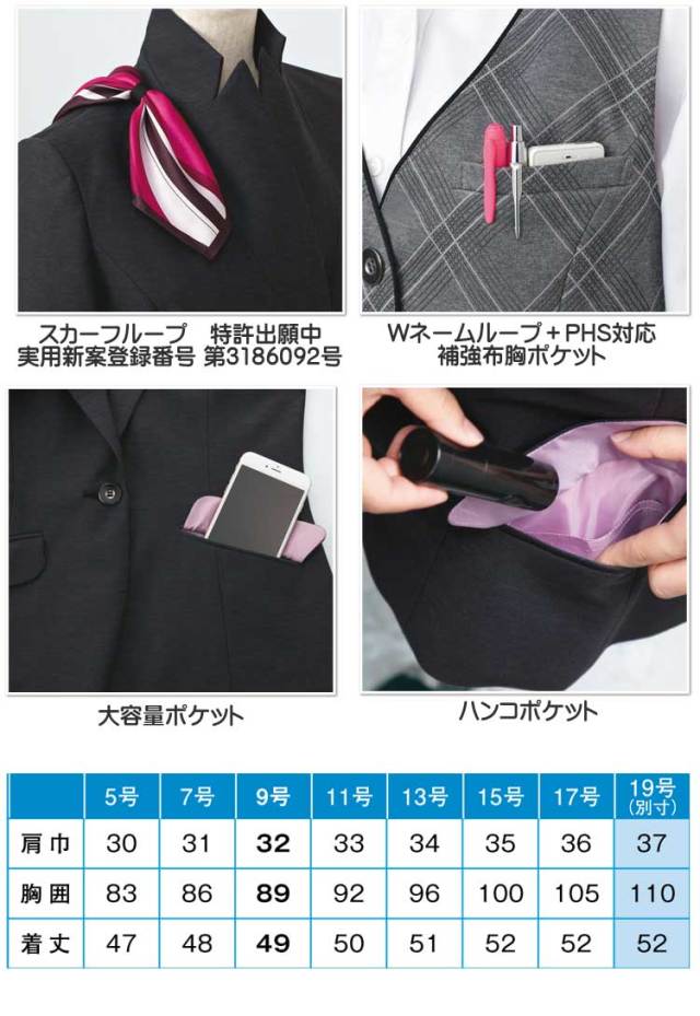 ※サイズ表には19号(トップス)、23号(ボトムス)も別寸として掲載しておりますが、備蓄されていない製品もございますので在庫についてはご注文後に確認となります。