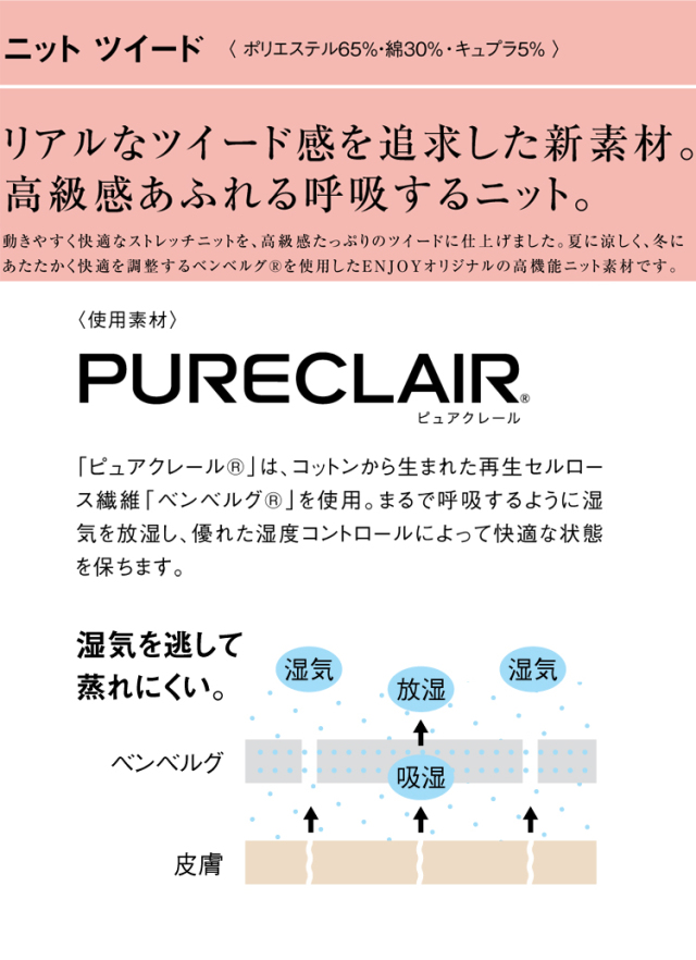 リアルなツイード感を追求した新素材。高級感あふれる呼吸するニット。動きやすく快適なストレッチニットを、高級感たっぷりのツイードに仕上げました。夏に涼しく、冬にあたたかく快適を調整するベンベルグ®を使用したENJOYオリジナルの高機能ニット素材です。見た目はジャケットでも着心地はカーディガン。