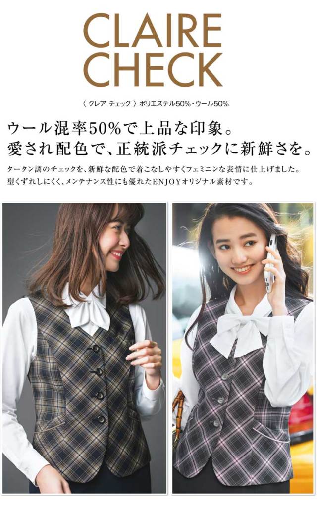 ウール混率50%で上品な印象を与えるベストです。タータン調のチェックを、新鮮な配色で着こなしやすくフェミニンな表情に仕上げました。型崩れしにくくメンテナンス性にも優れたENJOYオリジナル素材です。