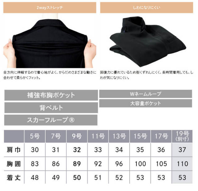 ※サイズ表には19号(トップス)、23号(ボトムス)も別寸として掲載しておりますが、備蓄されていない製品もございますので在庫についてはご注文後に確認となります。