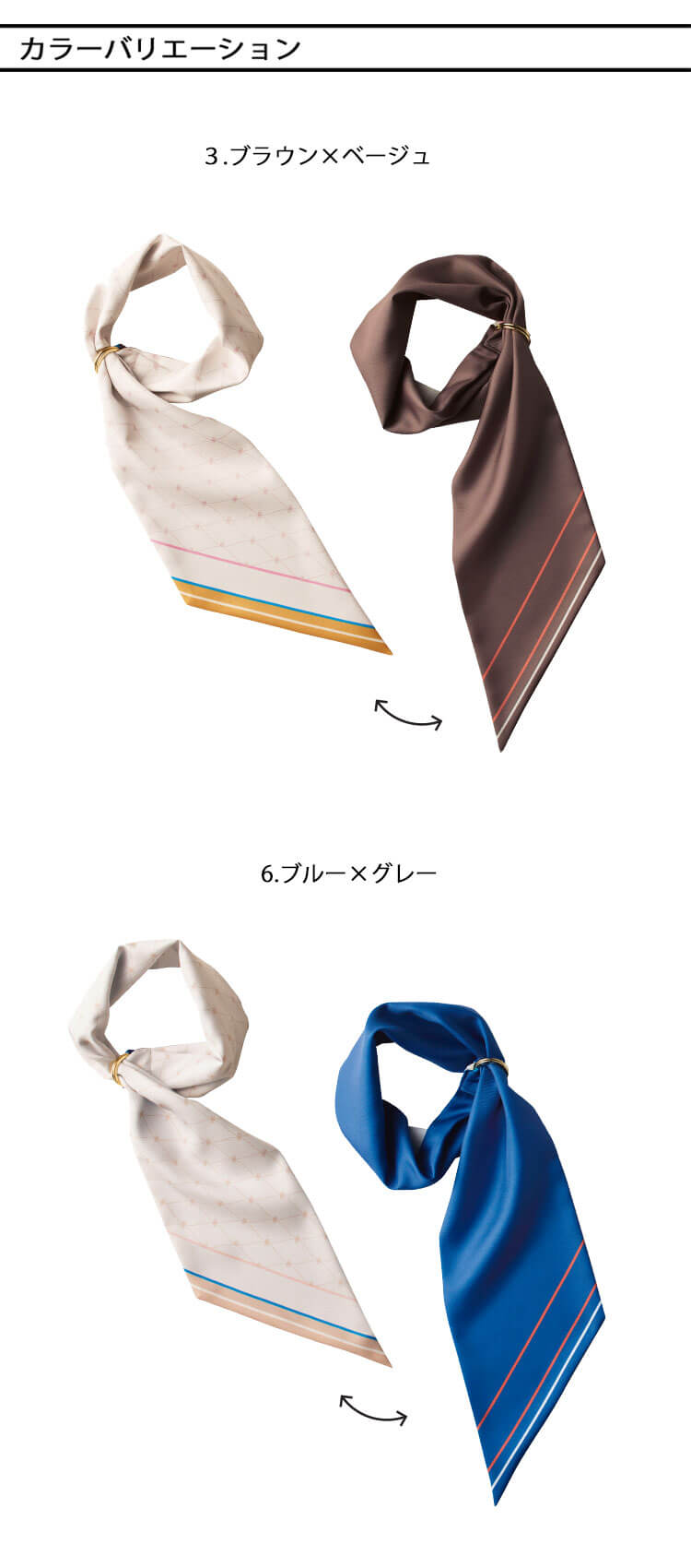 リバーシブル仕様のロングスカーフです。華やかな色は女性たちを一瞬で輝かせ、企業の個性をドラマティックに伝えます。スカーフが持つ色使いの魔法を、ぜひイメージアップにお役立てください。