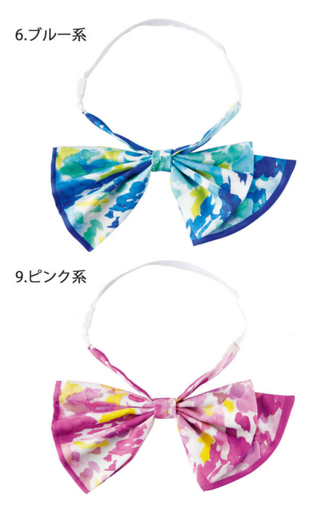花のような水彩タッチ柄です。リボン結びでも、サイドでミニスカーフとしても使える2wayリボンスカーフです。羽が2枚の方を左側にして着用すればかわいいリボン結びになります。