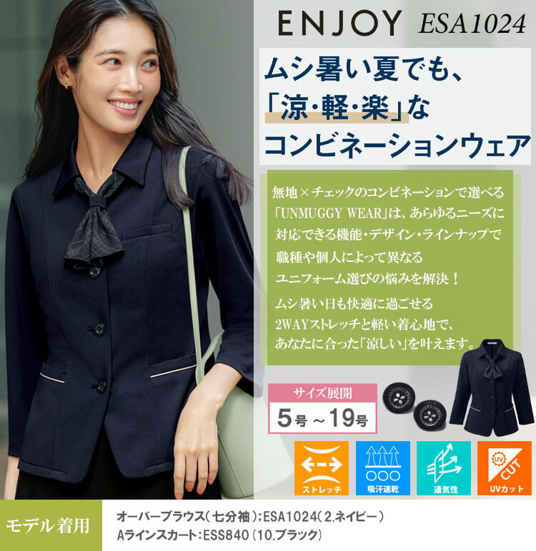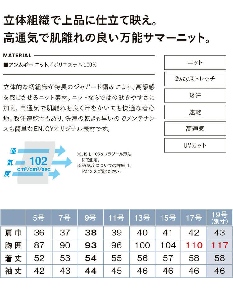 ムシ暑い夏でも、「涼・軽・楽」なコンビネーションウェアです。立体組織で上品に仕立て映え、高通気で肌離れの良い万能サマーニットです。 夏の冷房悩みも季節の変わり目も「快適」に過ごせる七分袖オーバーブラウスです。立体的な柄組織が特長のジャガード編みにより、高級感を感じさせるニット素材を使用しています。ニットならではの動きやすさに加え、高通気で肌離れもよく汗をかいても快適な着心地です。吸汗速乾性もあり、洗濯の乾きも早いのでメンテナンスも簡単なENJOYオリジナル素材です。