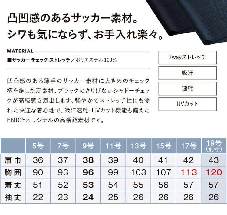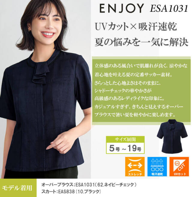カジュアルすぎず、きちんと見えするデザインで暑い夏を軽やかにします。フロント隠しボタンですっきり&首元のフリルがきちんと感を添える半袖のオーバーブラウスです。凹凸感のある薄手のサッカー素材に大きめのチェック柄を施した夏素材を使用しています。ブラックのさりげないシャドーチェックが高級感を演出します。軽やかでストレッチ性にも優れた快適な着心地で、吸汗速乾・UVカット機能も備えたENJOYオリジナルの高機能素材です。