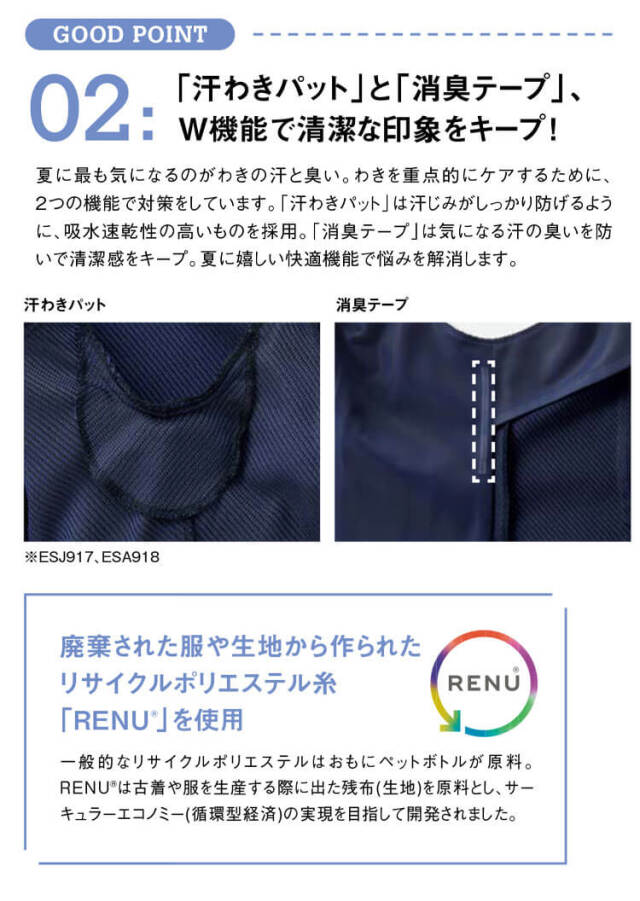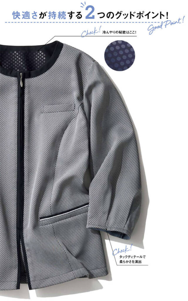 1つの企業で接客やデスクワークなど、業務に合わせて複数のユニフォームを取り入れたいとき、見た目のイメージを統一することで同じ空間で働くスタッフ同士、職種の違いを超えた仲間意識が自然と芽生え、企業としてのコーポレートアイデンティティを高めます。内勤・接客・外まわりなど、業務に合わせて選べる充実のラインナップです。 インカムループ付きなので、インカムを付けたときでもすっきりきれい見え。 ジップアップとポケットのおそろいデザインがチームの一体感を高めます。直に着用するオーバーブラウスとライトジャケットには、夏のお悩みを軽減する機能を追加しました。接触冷感機能の「冷んやりシート」は、首まわりの熱を下げて涼しさを持続させるので、暑い夏を快適に過ごせます。汗のニオイや汗ジミにも対応した嬉しい機能で夏のお悩みを解決します。平織りと綾織りの異なった組織を組み合わせることで立体感とシャンプレー感を表現した、高級感とシャープさを感じさせるカルゼ組織のENJOYオリジナル素材です。 使い終わった古着や工場での生産時に出た残布(生地)を原料とした繊維から繊維を作るリサイクルポリエステル糸「RENU(R)」を使用し、環境に配慮しています。