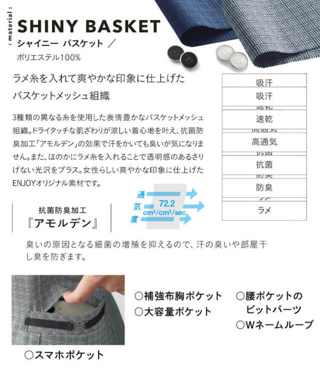 立ち姿をすらりと魅せながら、身体を締め付けない快適な着心地も追及した「美スラッと(R)クラス」です。 細見えを実現すべく計算されたパターンに加え、ラメ入りの生地やポケットデザインです。 縦のハイピングなど、細部にまで着映えポイントを詰め込み、より上品でクラス感のあるスマートな印象へと導く、新たな「美スラッと(R)」が誕生しました。着心地を追及するためにアップデートした12面体パターンです。12枚のパネルパーツを組み合わせ、着るだけでくびれやほっそりとした背中、再度の曲線美など、計算され尽くした立体的なシルエットです。スマートに着映え、理想のボディラインへと導きます。また、きれいに見えながらもきゅうくつ感がないので苦しくなく、快適な着心地を実現しました。3種類の異なる糸を使用した表現豊かなバスケットメッシュ組織です。 ドライタッチな肌ざわりが涼しい着心地を叶え、抗菌防臭加工「アモルデン」の効果で汗をかいても臭いが気になりません。 また、ほのかにラメ糸を入れることで透明感のあるさりげない光沢をプラスします。 女性らしい爽やかな印象に仕上げたENJOYオリジナル素材です。