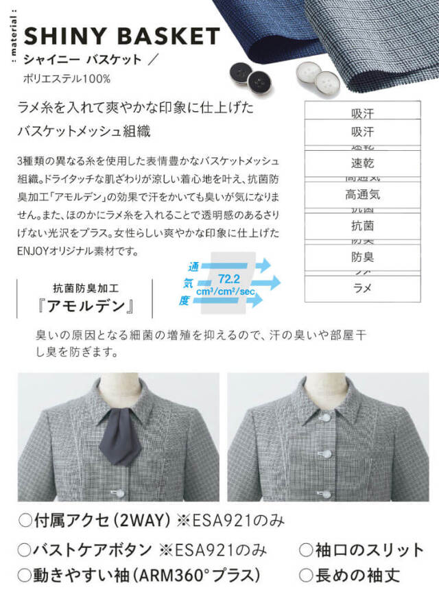 立ち姿をすらりと魅せながら、身体を締め付けない快適な着心地も追及した「美スラッと(R)クラス」です。 細見えを実現すべく計算されたパターンに加え、ラメ入りの生地やポケットデザインです。 縦のハイピングなど、細部にまで着映えポイントを詰め込み、より上品でクラス感のあるスマートな印象へと導く、新たな「美スラッと(R)」が誕生しました。着心地を追及するためにアップデートした12面体パターンです。12枚のパネルパーツを組み合わせ、着るだけでくびれやほっそりとした背中、再度の曲線美など、計算され尽くした立体的なシルエットです。スマートに着映え、理想のボディラインへと導きます。また、きれいに見えながらもきゅうくつ感がないので苦しくなく、快適な着心地を実現しました。3種類の異なる糸を使用した表現豊かなバスケットメッシュ組織です。 ドライタッチな肌ざわりが涼しい着心地を叶え、抗菌防臭加工「アモルデン」の効果で汗をかいても臭いが気になりません。 また、ほのかにラメ糸を入れることで透明感のあるさりげない光沢をプラスします。 女性らしい爽やかな印象に仕上げたENJOYオリジナル素材です。