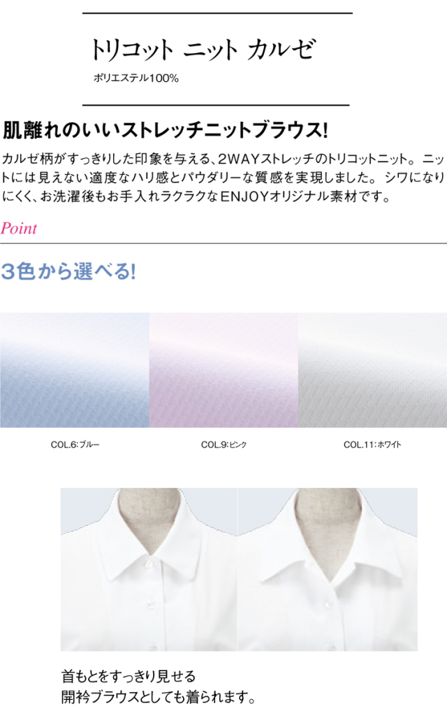 肌離れの良いストレッチニットブラウスです。カルゼ柄がすっきりした印象を与える2WAYストレッチのトリコットニットです。ニットには見えない適度なハリ感とパウダリーな質感を実現しました。シワになりにくく、お洗濯後もお手入れラクラクなENJOYのオリジナル素材です。着心地はカジュアルで見た目はきちんとしたブラウスです。