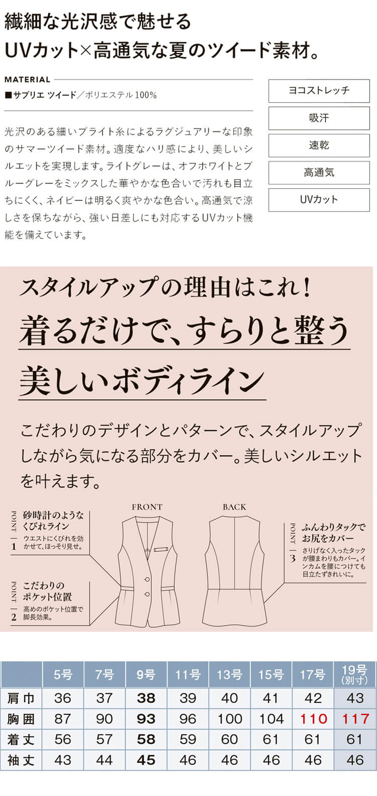 フロントVカットで首元を涼しく美しく魅せるライトジャケットです。長めの着丈でパンツとの相性も抜群です!素材には、光沢のある細いブライト糸によるラグジュアリーな印象のサマーツイードを使用しています。適度なハリ感により、美しいシルエットを実現します。ライトグレーは、オフホワイトとブルーグレーをミックスした華やかな色合いで汚れも目立ちにくく、ネイビーは明るく爽やかな色合いです。高通気で涼しさを保ちながら、強い日差しにも対応するUVカット機能を備えています。