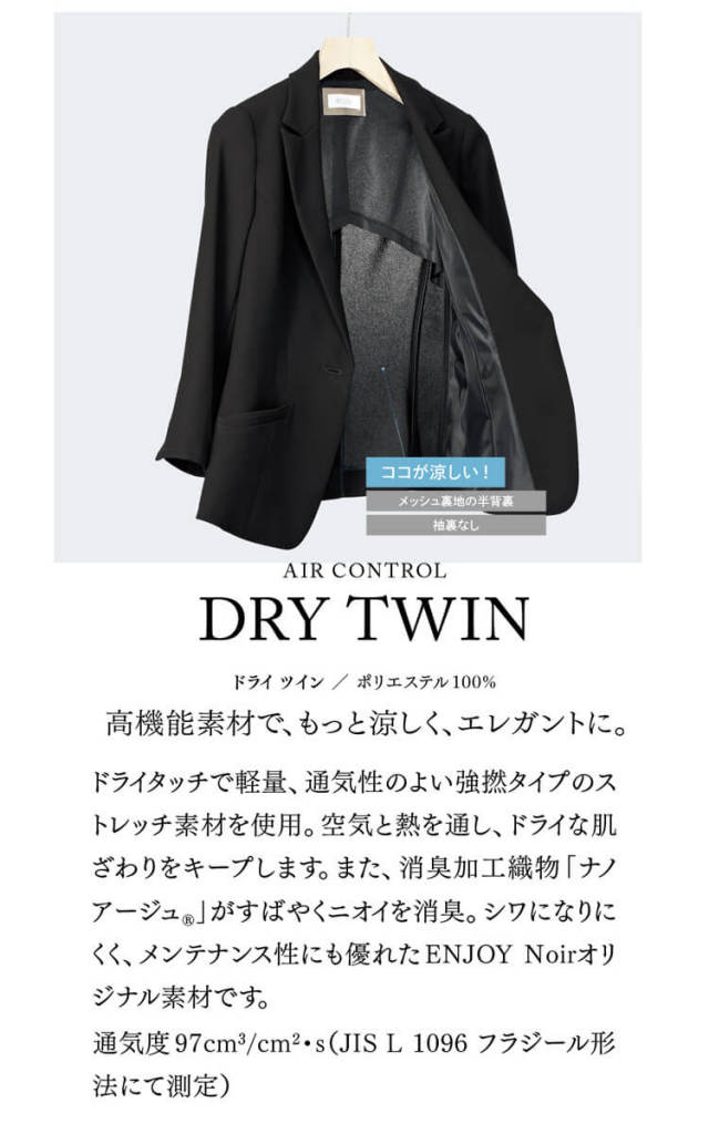 どんな暑い日も笑顔絶やさず、最高のサービスを届けたい、その想いを叶えるために生まれた、究極に涼しいブラックスーツです。美しい色と緻密なデザインで、接する人にも清々しさを感じさせます。ドライタッチで軽量、通気性のよい強撚タイプのストレッチ素材を使用しています。空気と熱を通し、ドライな肌ざわりをキープします。