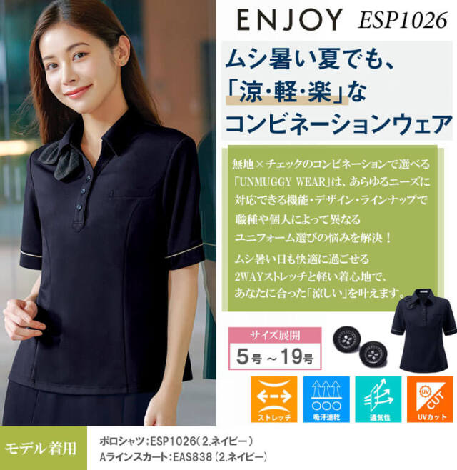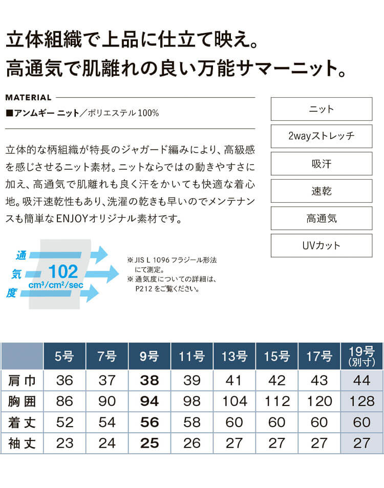 ムシ暑い夏でも、「涼・軽・楽」なコンビネーションウェアです。立体組織で上品に仕立て映え、高通気で肌離れの良い万能サマーニットです。 すっきりとした襟あきとチェック柄のリボンで上品な印象のポロシャツです。立体的な柄組織が特長のジャガード編みにより、高級感を感じさせるニット素材を使用しています。ニットならではの動きやすさに加え、高通気で肌離れもよく汗をかいても快適な着心地です。吸汗速乾性もあり、洗濯の乾きも早いのでメンテナンスも簡単なENJOYオリジナル素材です。