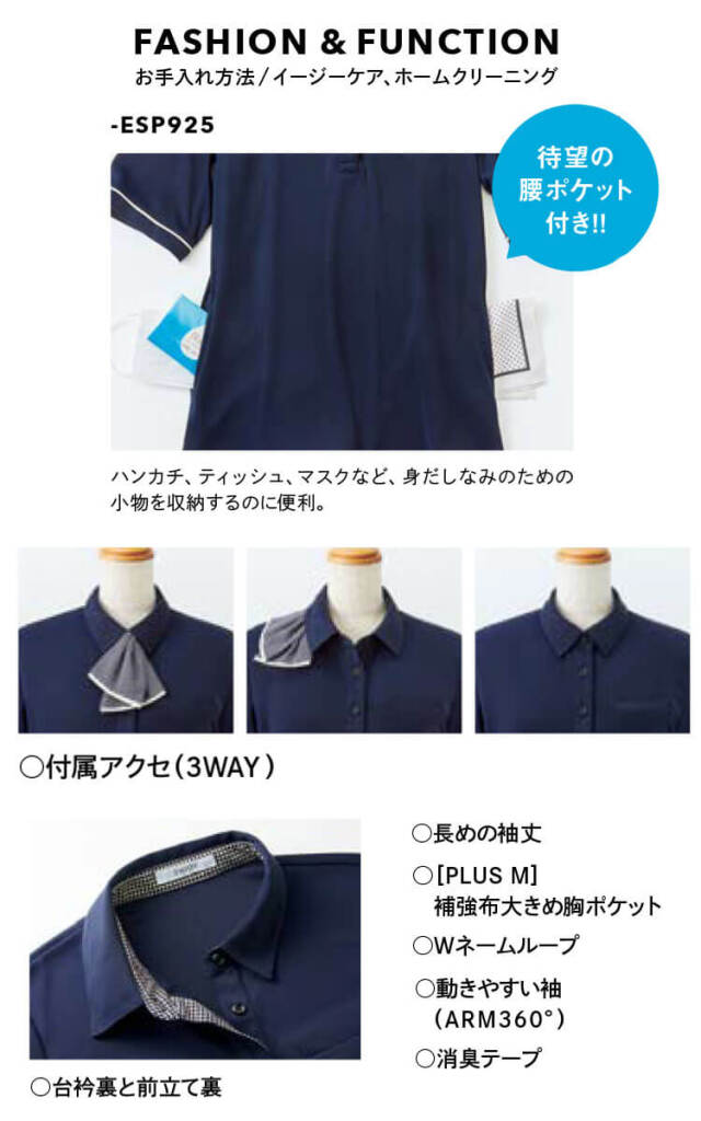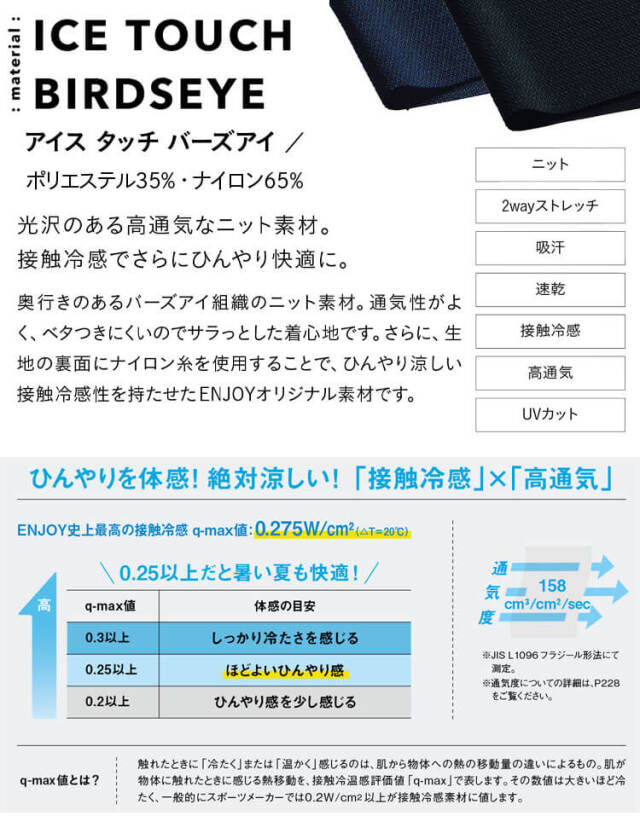 女性のためのクールビズ「オフィスポロ」から、涼しい機能性をアップし、近年の酷暑にも対応できる画期的な涼感アイスタッチポロが登場しました。 「接触冷感」と「高通気」をグレードアップした生地は触った瞬間ひんやりします。 ポイントにあしらった千鳥チェックと相まって、見た目の印象もより爽やかです。 新機能の腰ポケットが付いたことで、便利になったのも嬉しいポイントです。腰ポケットが付いてさらに便利になりました。 従来の丈感よりも少し長めのつくりなので、パンツにも合わせやすい丈感です。 スカーフは付け替え可能な2Wayデザインです。ノーカラーのタイ風で、首元を美しく上品な印象になります。 サックスのラインと千鳥チェックで爽やかです。親しみやすさもアップします。 ミニアスコットタイは、スナップボタンを留めるだけで誰でも簡単に形がつくれます。奥行きのあるバーズアイ組織のニット素材です。 通気性がよく、ベタつきにくいのでサラッとした着心地です。 さらに、ナイロン糸を使用することでひんやり涼しい接触冷感を持たせたENJOYオリジナル素材です。