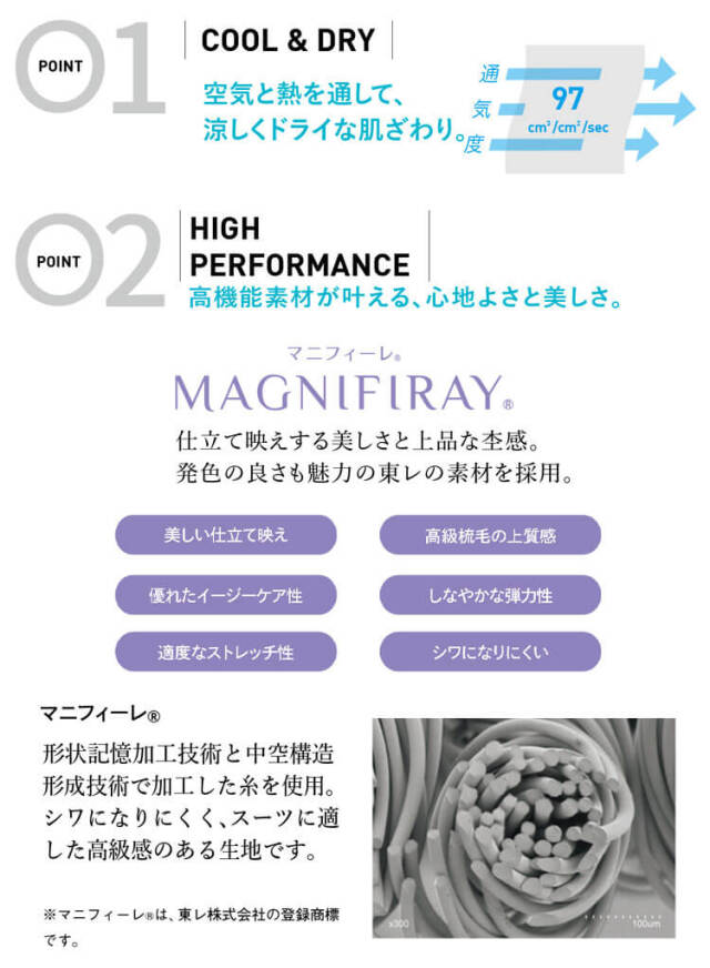 高機能素材でもっと涼しく、エレガントなシリーズです。ドライタッチで軽量、通気性の良い強撚タイプのストレッチ素材を使用しています。空気と熱を通し、ドライな肌ざわりをキープします。また、東レのアンモニア消臭加工を付与することですばやくニオイを消臭します。シワになりにくく、メンテナンス性にも優れたENJOYオリジナル素材です。