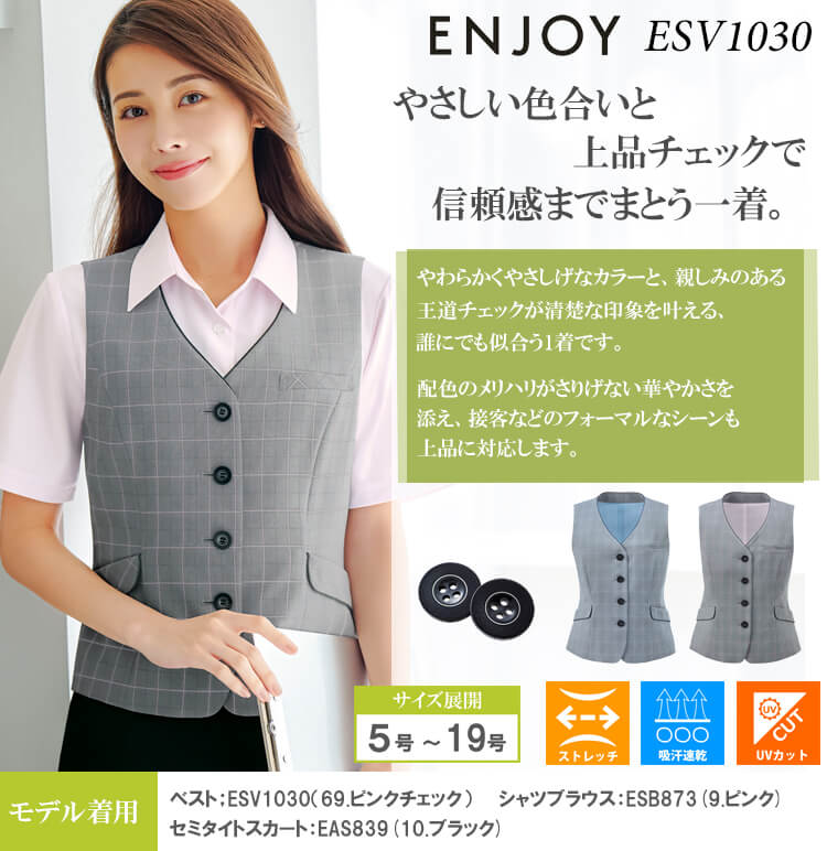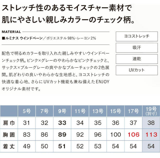 やさしいカラーとシンプルなデザインで、どんなブラウスとも合わせやすいチェックベストです。首元と腰位置の濃色パイピングで引き締まった印象にします。素材には、配色で明るめカラーを取り入れた親しみやすいウインドペーンチェック柄を使用しています。ピンク×グレーのやわらかなピンクチェックと、サックス×ブルーグレーの爽やかなブルーチェックの2色展開です。肌ざわりの良いやわらかな生地感と、ヨコストレッチの快適な着心地、さらにUVカット機能も兼ね備えたENJOYオリジナル素材です。
