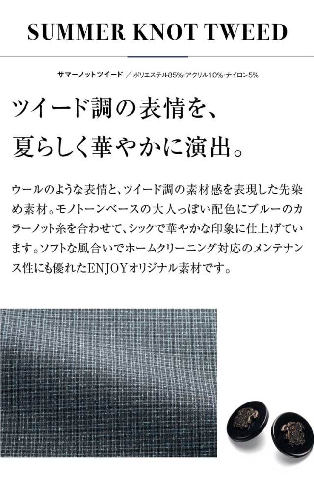 ツイード調の表情を、夏らしく華やかに演出。ウールのような表情と、ツイード調の素材感を表現した先染め素材。モノトーンベースの大人っぽい配色にブルーのカラーノット糸を合わせて、シックで華やかな印象に仕上げています。ソフトな風合いでホームクリーニング対応のメンテナンス性にも優れたENJOYオリジナル素材です。