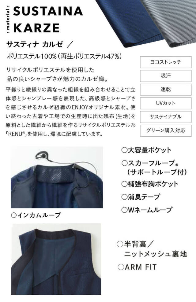 1つの企業で接客やデスクワークなど、業務に合わせて複数のユニフォームを取り入れたいとき、見た目のイメージを統一することで同じ空間で働くスタッフ同士、職種の違いを超えた仲間意識が自然と芽生え、企業としてのコーポレートアイデンティティを高めます。内勤・接客・外まわりなど、業務に合わせて選べる充実のラインナップです。 インカムループ付きなので、インカムを付けたときでもすっきりきれい見え。 ジップアップとポケットのおそろいデザインがチームの一体感を高めます。直に着用するオーバーブラウスとライトジャケットには、夏のお悩みを軽減する機能を追加しました。接触冷感機能の「冷んやりシート」は、首まわりの熱を下げて涼しさを持続させるので、暑い夏を快適に過ごせます。汗のニオイや汗ジミにも対応した嬉しい機能で夏のお悩みを解決します。平織りと綾織りの異なった組織を組み合わせることで立体感とシャンプレー感を表現した、高級感とシャープさを感じさせるカルゼ組織のENJOYオリジナル素材です。 使い終わった古着や工場での生産時に出た残布(生地)を原料とした繊維から繊維を作るリサイクルポリエステル糸「RENU(R)」を使用し、環境に配慮しています。