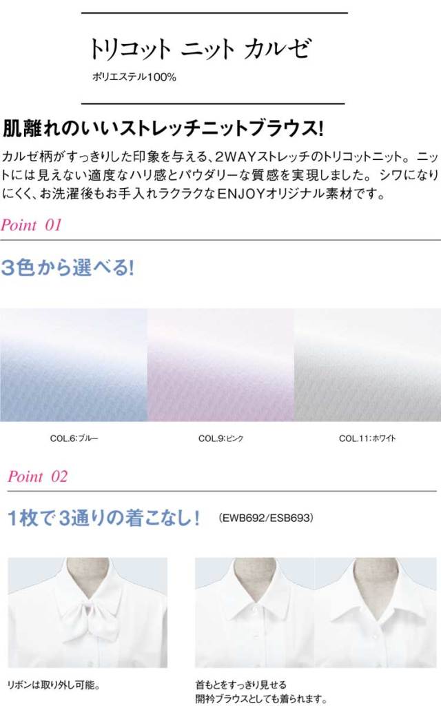 肌離れの良いストレッチニットブラウスです。カルゼ柄がすっきりした印象を与える2WAYストレッチのトリコットニットです。ニットには見えない適度なハリ感とパウダリーな質感を実現しました。シワになりにくく、お洗濯後もお手入れラクラクなENJOYのオリジナル素材です。着心地はカジュアルで見た目はきちんとしたブラウスです。