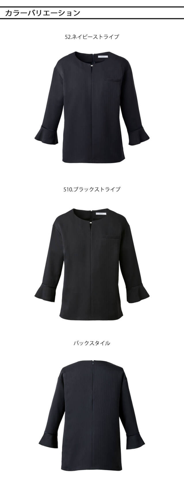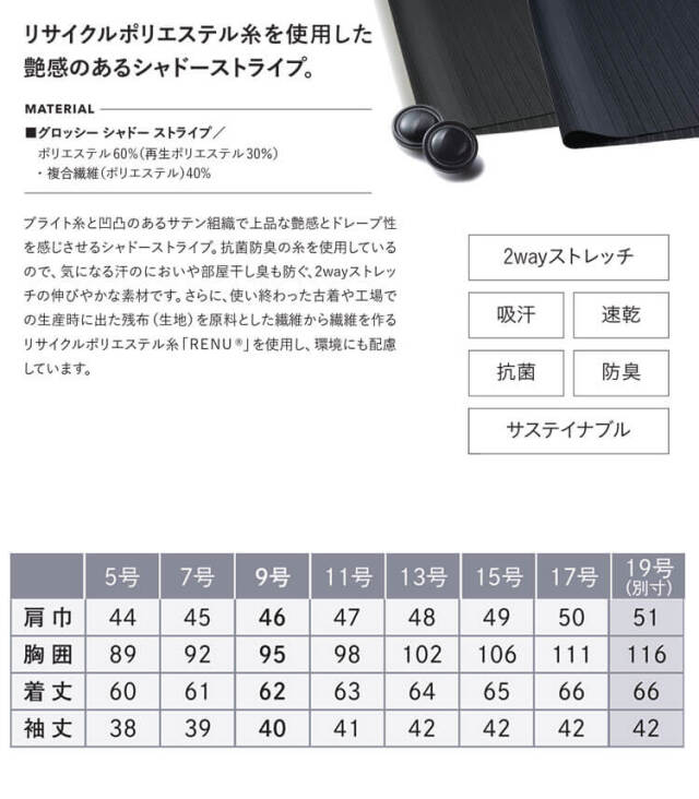 シャープな艶やかさを秘めた服です。艶感のあるシャドーストライプ生地、女性らしさを引き立てるシルエットに、大人の女性の格好良さをプラスしました。抗菌防臭、インカムをすっきり収納できるループなど、機能面にもこだわった「Glossy Flora」です。鮮度の高いラグジュアリーな印象のシリーズです。オールシーズン着られて統一感をキープ出来る万能プルオーバーです。カーディガンの組み合わせで賢く体温調節したり、スカートの組み合わせでワンピース見えも◎です。素材はブライト糸と凹凸のあるサテン組織で女性らしい艶感とドレープ性を感じさせるシャドーストライプ。抗菌防臭の糸を使用しているので、気になる汗のにおいや部屋干し臭も防ぐ、2WAYストレッチの快適で伸びやかな着心地の素材です。さらに、使い終わった古着や工場での生産時に出た残布(生地)を原料とした繊維から繊維を作るリサイクルポリエステル糸「RENU」を使用しているので環境にも配慮しています。