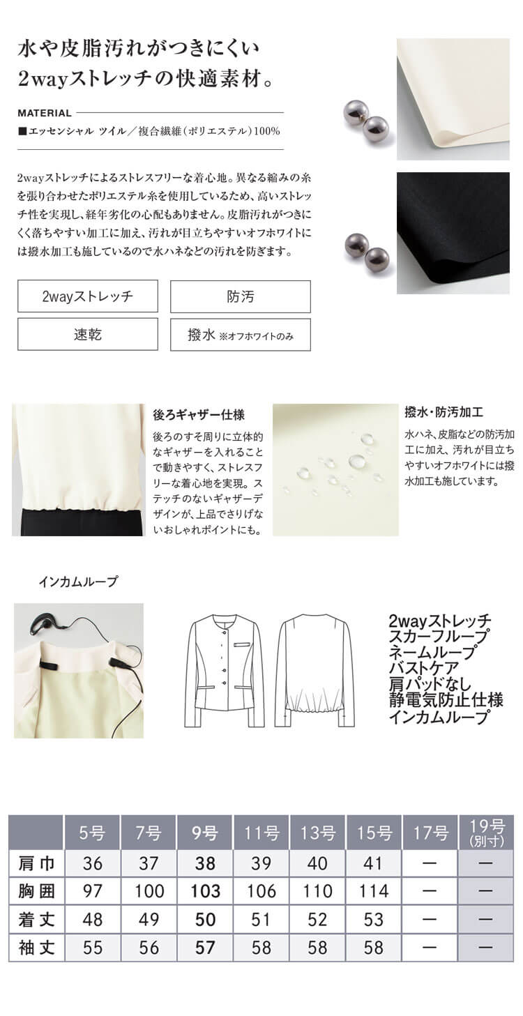快適な着心地とフォーマルなルックスの理想的なバランスを実現させた「EFFORTLESS」シリーズです。“気楽に着れる”新しいフォーマルスタイルのおもてなしウェアです。きゅうくつ感、作業のしづらさといったジャケットの着用の悩みを見つめ直してできたアイテム「ジャケゾン」です。動きやすいブルゾンにジャケットの高級感あるデザインを取り入れ、ボトムスとのコーディネイトで季節を問わず、幅広い着回しを可能にしました。前から見るとジャケット、後ろはブルゾンの特徴でもあるバックギャザー仕様です。立体的なギャザーが上品で、さりげないおしゃれポイントになっています。また定番のブラックに加えて、対面接客におけるライトカラーニーズにも応えて、汚れにくく透けにくいオフホワイトの展開もあります。2wayストレッチによるストレスフリーな着心地の素材は、異なる縮みの糸の張り合わせたポリエステル糸を使用しているため、経年劣化の心配がありません。皮脂汚れがつきにくく落ちやすい加工に加え、汚れが目立ちやすいオフホワイトには撥水加工も施しているので水ハネなどの汚れも防ぎます。高いストレッチ性があるので着用しやすいのも嬉しいポイント◎です。