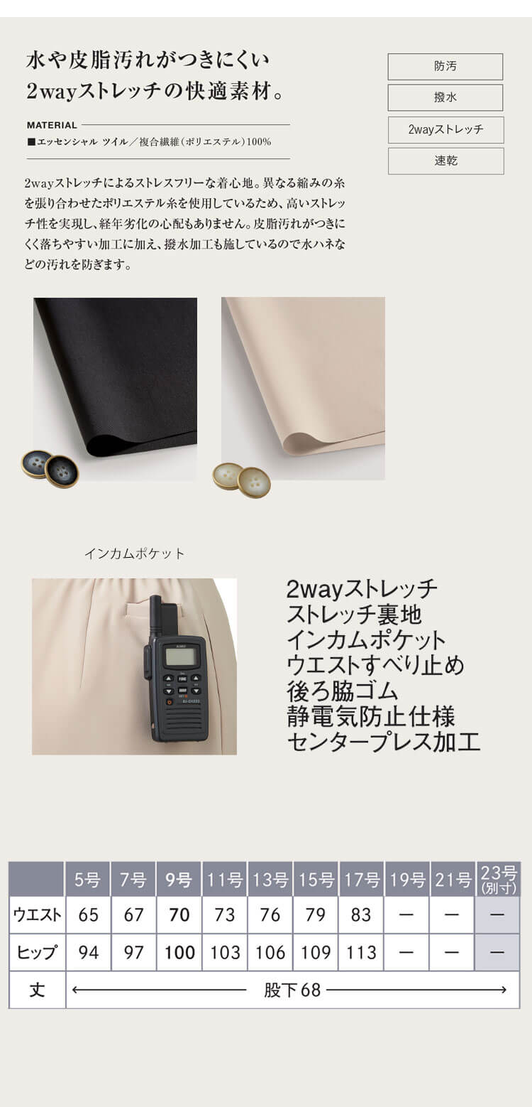 組み合わせ自在に、新感覚のフォーマルスタイル「NOBLE CROSS」です。控えめでありながらラグジュアリー感あふれる、計算され尽くしたデザインの数々です。まさに「NOBLE」の名にふさわしい新感覚のホスピタリティウエアです。クロスコーデを意識したシンプルカラー、動きやすさや収納力へのこだわりも魅力です。ウエストにベルト配色をデザインしたテーパードパンツです。トップスをインした時に、ウエストが引き締まって見える効果も◎です。2wayストレッチによるストレスフリーな着心地の快適素材。異なる縮みの糸の張り合わせたポリエステル糸を使用しているため、経年劣化の心配がありません。特性として、染色工程で糸がらせん形状(スプリング形状)となるため高いストレッチ性を発揮します。また、防汚加工を施しているので水ハネなどの汚れを防ぎます。