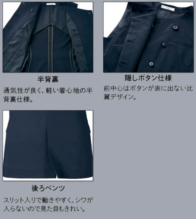 後ろベンツで動きやすくシワが入らないので見た目も綺麗です。あらゆる接客シーンにふさわしく、接客時に気になる静電気を防止します。生地に電導糸を織り込むことで静電気を防止します。接客時の「パチッ」を防ぎ、お客さまに不快感を与えません。乾燥する季節も安心です。着用済みユニフォームを原材料とした、「BRING Material」をブレンドした循環型素材です。しなやかなクリンプ形状の特殊構造加工糸「LUXTRIMA」を使用し、抜群の2wayストレッチを実現したENJOY Noirオリジナル素材です。