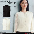 快適な着心地とフォーマルなルックスの理想的なバランスを実現させた「EFFORTLESS」シリーズです。“気楽に着れる”新しいフォーマルスタイルのおもてなしウェアです。オールシーズンを叶えるやさしく気品のあるベストは、アクセサリーなしでもボタンの印象でシックでスタイリッシュな雰囲気です。ブラックのベストは同色のボトムスと相性が良いので、 ワイドパンツをコーディネイトすることで、よりマニッシュでトレンド感あるスタイルに。中に着るブラウスの組み合わせ方を変えればオールシーズンの着用も可能です。2wayストレッチによるストレスフリーな着心地の素材は、異なる縮みの糸の張り合わせたポリエステル糸を使用しているため、経年劣化の心配がありません。皮脂汚れがつきにくく落ちやすい加工に加え、汚れが目立ちやすいオフホワイトには撥水加工も施しているので水ハネなどの汚れも防ぎます。高いストレッチ性があるので着用しやすいのも嬉しいポイント◎です。
