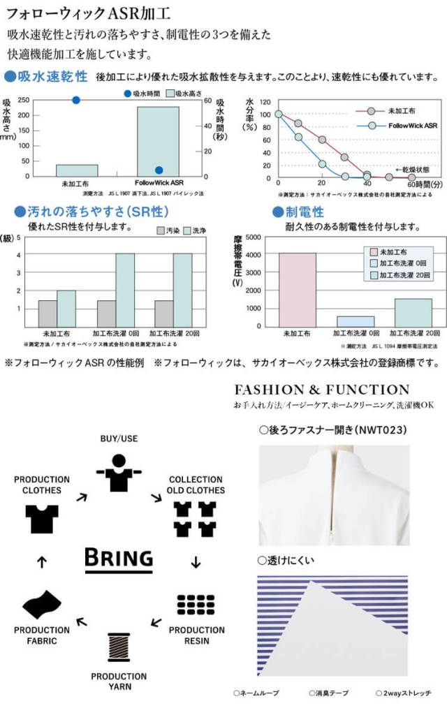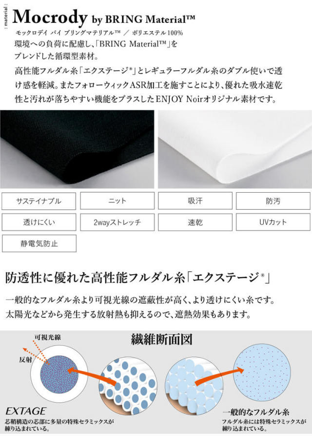 着用済みユニフォームを原材料とした「BRING Material」をブレンドした循環型素材です。これからの時代にふさわしい素材です。高性能フルダル糸「エクステージ」とレギュラーフルダル糸のダブル使いで透け感を軽減します。またフォローウィックASR加工を施すことにより、優れた吸水速乾性と汚れが落ちやすい機能をプラスしたENJOY Noirオリジナル素材です。