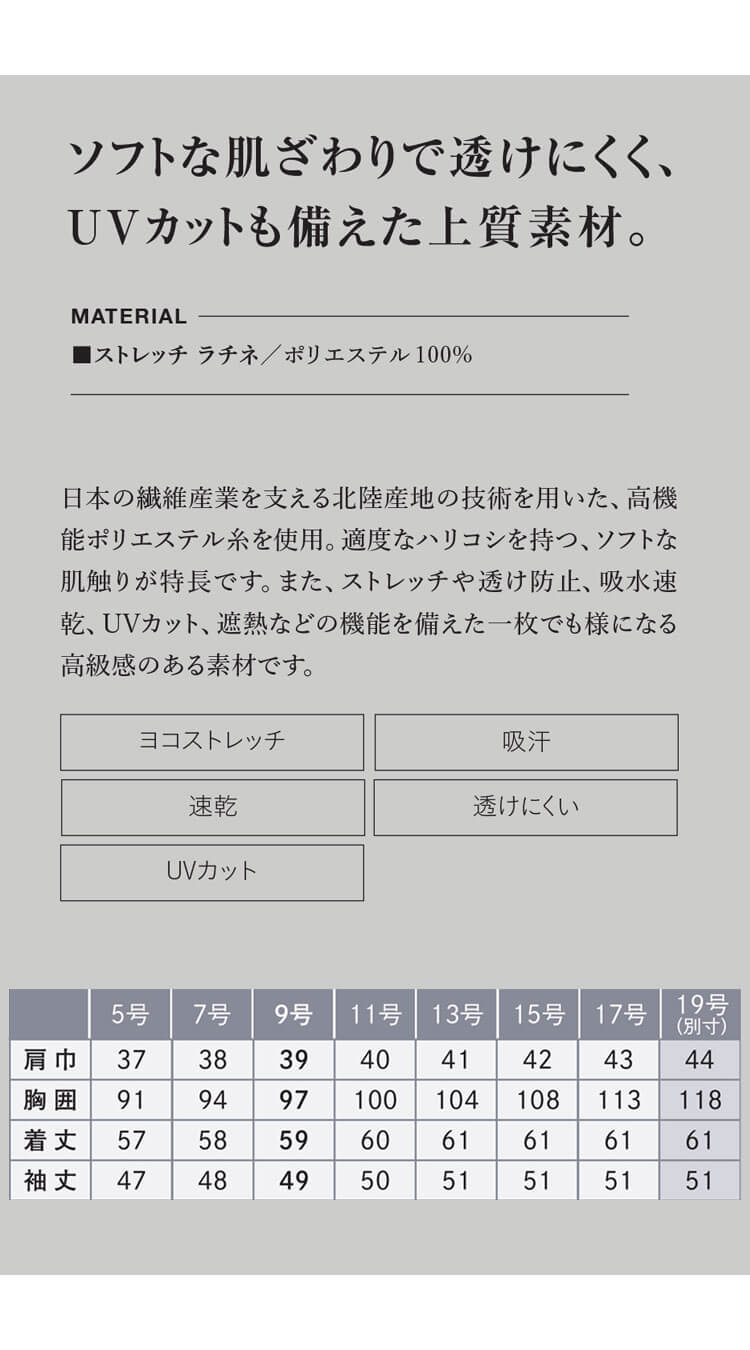 1枚で、凛とした姿「ノワールトップス」です。シンプルなフロントデザインとしなやかな素材感が際立つ洗練された八分丈スタンドカラーブラウスです。着脱しやすいフロントファスナー仕様です。デザインポイントとして、襟にゴールドのボタンをプラスしました。素材には日本の繊維産業を支える北陸産地の技術を用いた、高機能ポリエステル糸を使用しました。適度なハリコシを持つ、ソフトな肌触りが特長です。また、ストレッチや透け防止、吸水速乾、UVカットなどの機能を備えた一枚でも様になる高級感のあるブラウスです。
