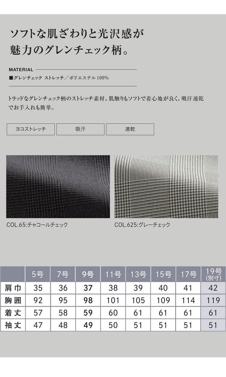 1枚で、凛とした姿「ノワールトップス」です。ほどよい光沢感が上品でエレガントな印象のスタンドカラーシャツです。トラッドなグレンチェック柄のストレッチ素材を使用し、肌触りもソフトで着心地が良く、吸汗速乾でお手入れも簡単です。