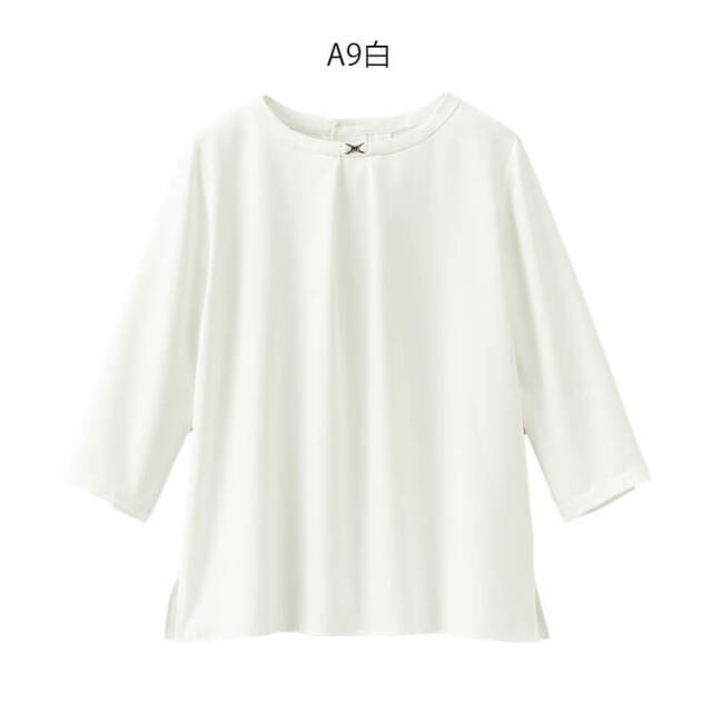 ビット付きのアクセサリーデザインの七分袖ブラウスです。背中にタックを施し、着脱がラクラクです。Vネックデザインのジャケットインに最適です。接触冷感、UVカット機能を備えています。家庭洗濯が可能です。
