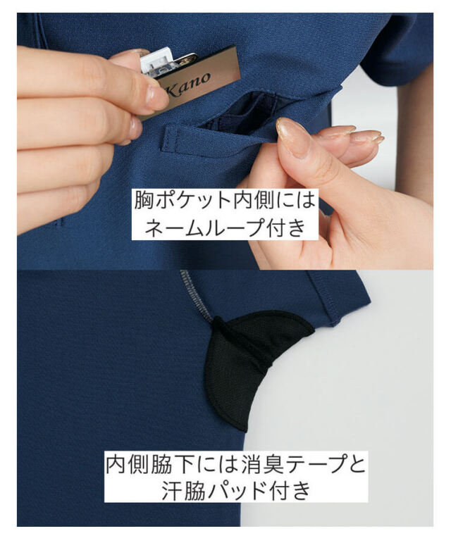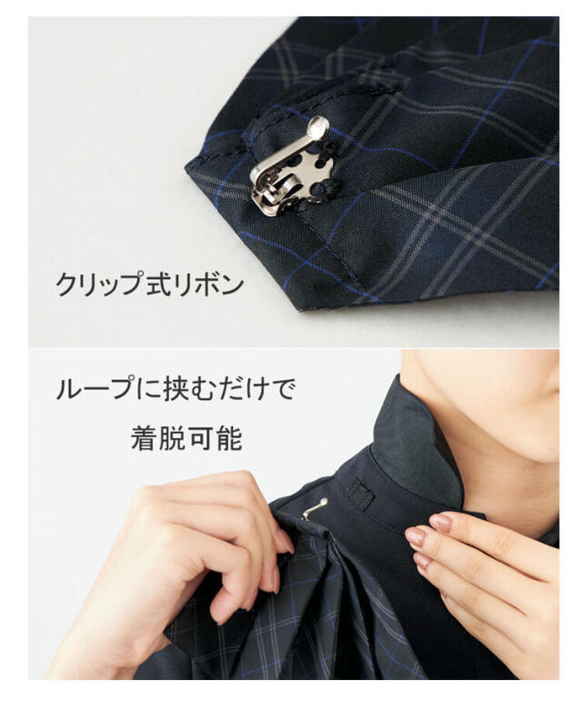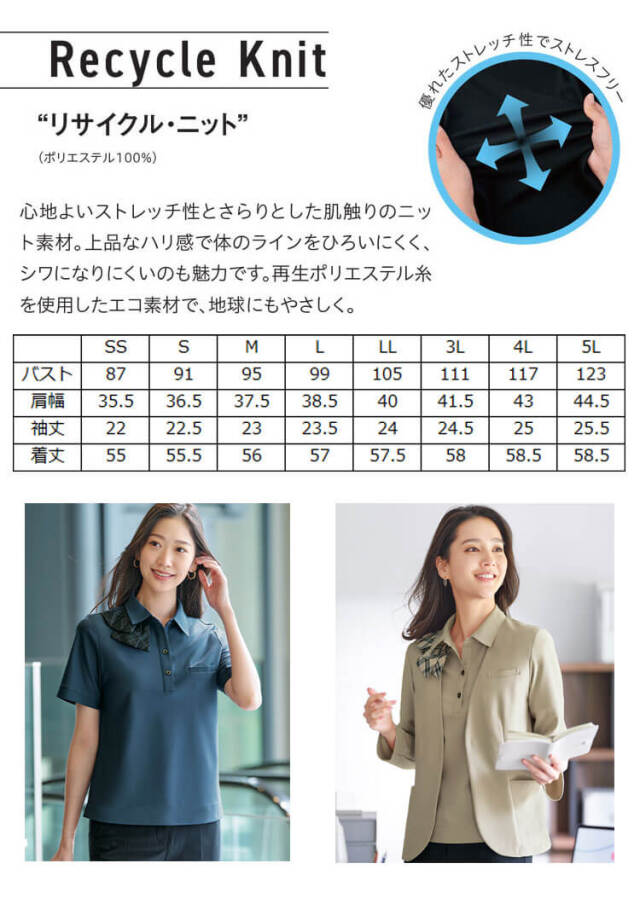爽やかなインクブルーが印象的なきちんと見えするポロシャツ。廃棄衣料から生まれた再生ポリエステル糸を100%使用、環境に配慮されたエコ素材です。 ほどよいハリ感の素材で身体のラインをひろいにくく、シワになりにくいのも魅力。シャープな襟元で、チェック柄のリボンがアクセント。かがんでも腰回りにゆとりをキープでき、袖丈は少し長めの23.5cm。