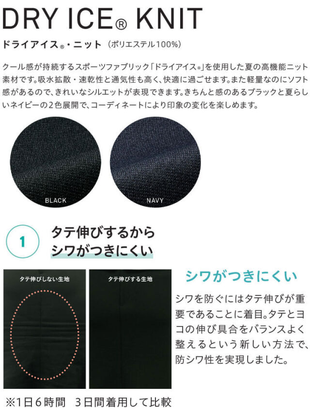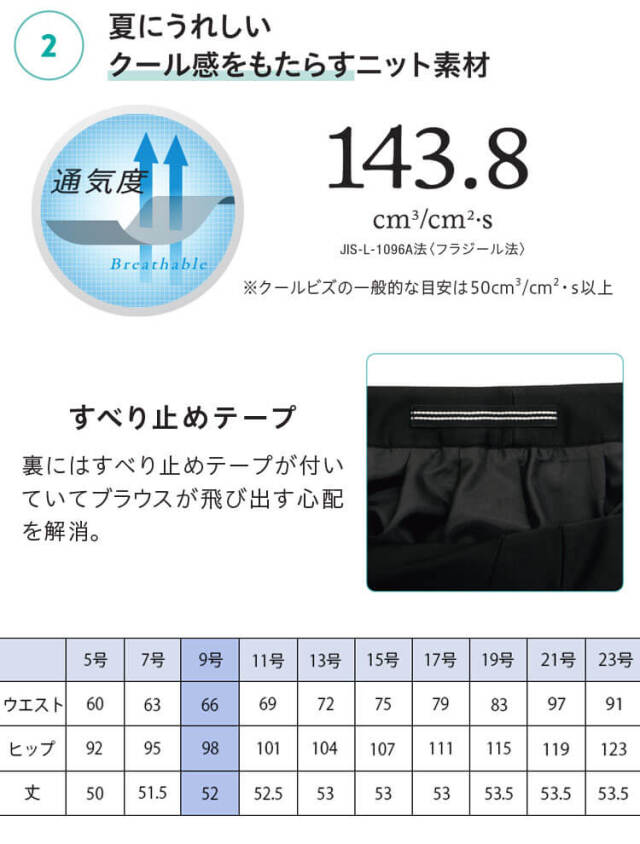 高機能ニット素材の夏用キュロットです。軽量でソフト感のある素材を使用しているのできれいなシルエットが特長です。両脇にポケット、ベルト裏に滑り止めテープ付きです。きちんと感のあるブラックと夏らしいネイビーの2色展開でコーディネートの幅が広がります。