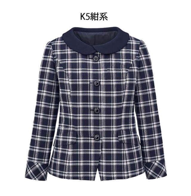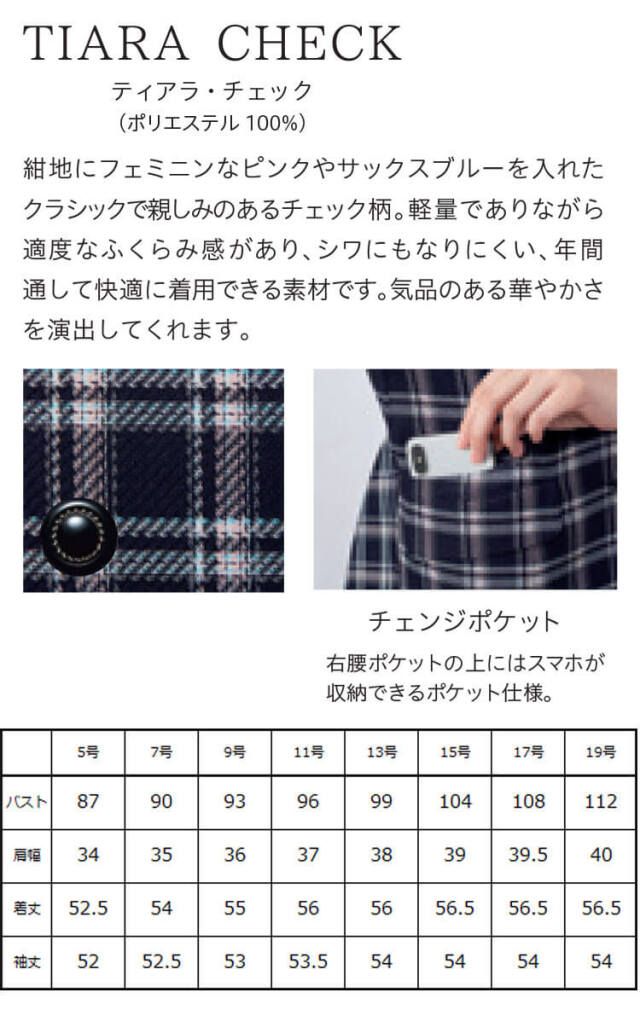 紺地にピンクやサックスブルーを入れたフェミニンで親しみのあるチェック柄です。気品のある華やかさを演出でき、年間を通して快適に着用できます。重なった衿が上品で可愛らしいデザインです。後ろウエストには紺生地を挟み込んだ腰高に見えるラインを入れました。袖口にはスリットが入っていて折り返しが可能です。左胸ポケットにネームホルダー、右腰にスマホ用ポケットが付いています。同素材や紺無地のボトムとコーディネートできるので幅広い職種で着用していただけます。