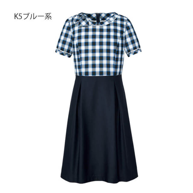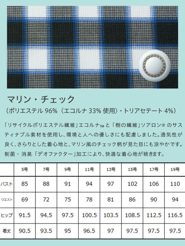 リサイクルポリエステル繊維「エコルナ(TM)」と樹の繊維「ソアロン(R)」を使用したワンピースです。スカート部分は涼しいドライアイスニット(R)を使用しています。見た目に爽やかなマリン風チェック柄で、メッシュ素材ながらも透けにくいのも良さです。衿ぐり、袖口には白のパイピングを入れ清涼感をアップしたデザインです。胸元のリボンは取り外し可能、胸ポケットにはネームホルダー、スカートの両腰にはシームポケットが付いています。家庭で洗濯ができます。シワも目立ちません。