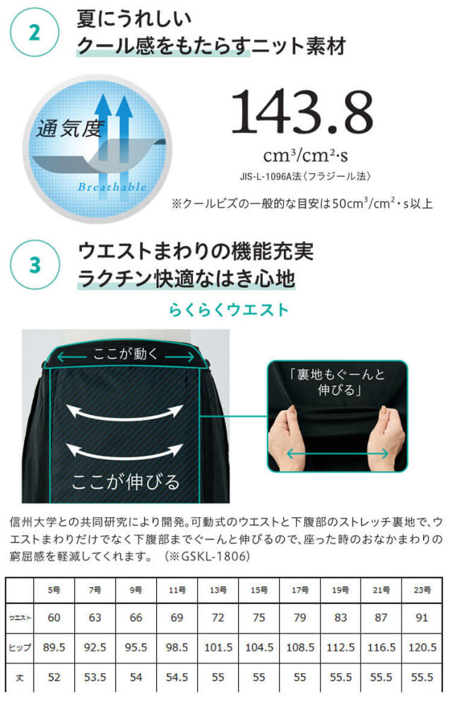 タテ伸びすることでシワになりにくい、ニット素材のスカートです。信州大学繊維学部との共同開発で着衣ストレスが軽減された効果が実証されている商品です。仕様はウエストからヒップにかけて着席時の体の伸びに合わせた可動式になっており、圧迫感を軽減しています。生地はスポーツ素材ドライアイス(R)を使用しているので身体の熱を効果的に逃がし、快適でクールな着用感です。さらに軽量なのにソフト感があるので、きれいなシルエットを表現できます。後ろマーメイドのAラインシルエットで両サイドにポケット付き、ネイビーとブラックの2色展開、家庭洗濯可能の商品です。