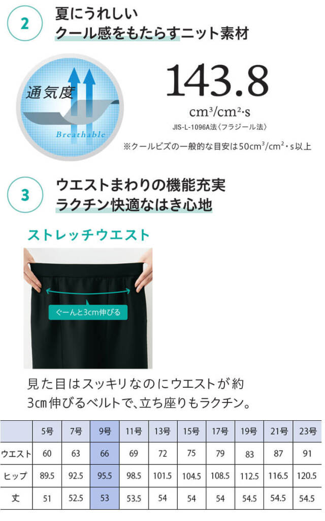 クール感が持続するスポーツファブリック「ドライアイス(R)」を使用した夏の高機能ニット素材の夏用スカートです。吸水拡散・速乾性と通気性も高く、快適に過ごせます。軽量でソフト感のある素材を使用しているのできれいなシルエットが特長です。ストレッチウエスト、両脇にポケット、ベルト裏に滑り止めテープ付きです。きちんと感のあるブラックと夏らしいネイビーの2色展開でコーディネートの幅が広がります。