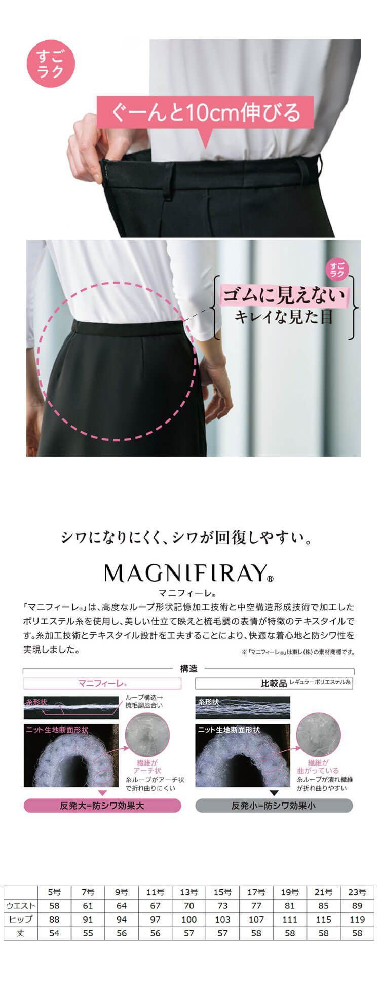 黒にはブロンズ、紺にはブルーを配色した繊細で美しいストライプ柄です。高級感ある見た目と、シワになりにくく、ストレッチ性・イージーケア性に優れた進化系ニット素材です。美しい仕立て映えと櫛毛調の表情が特徴の「マニフィーレ(R)」を使用しました。前ウエストはお腹に刺さりにくいゴム入りで、10cmのびるすごラクウエストで長時間の着用でも快適です。膝が隠れる長め丈です。