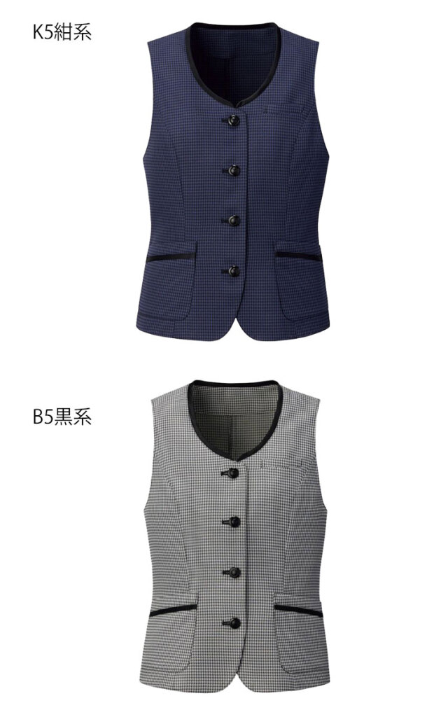 細かなチェック柄の裏無しベストです。黒テープのトリミングと釦で引き締め効果があります。胸ポケットにはネームホルダー付き、両腰のポケットはスマートフォンが入る大きさ、左腰ポケットは小分けポケット付きです。オーソドックスなスターチェック柄は誰にも着こなしやすく、コーディネートしやすいのが魅力です。ブラックとネイビーの2色展開です。