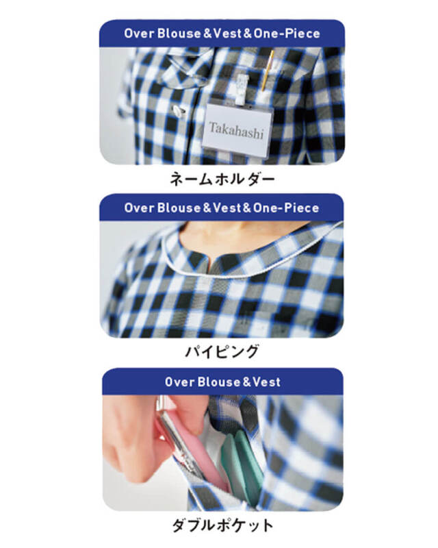 リサイクルポリエステル繊維「エコルナ(TM)」と樹の繊維「ソアロン(R)」を使用したベストです。見た目に爽やかなマリン風チェック柄でメッシュ素材ながらも透けにくいのも良さです。襟ぐり、ポケットには白のパイピングを入れ清涼感をアップしたデザインです。シルバーを組み合わせた釦も涼し気な印象に仕上げています。胸ポケットにはネームホルダー、右腰ポケットは内側に小さなポケットが付いています。バックベルトが付いておりサイズ調節可能です。家庭で洗濯ができます。シワも目立ちません。