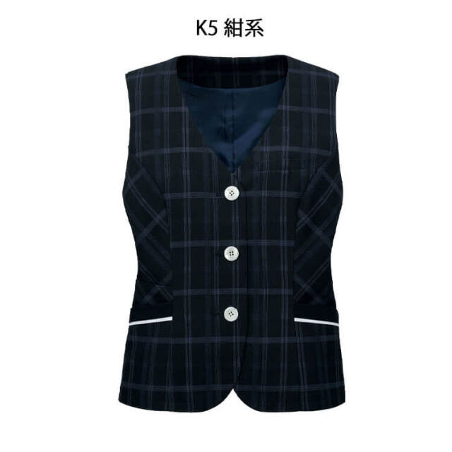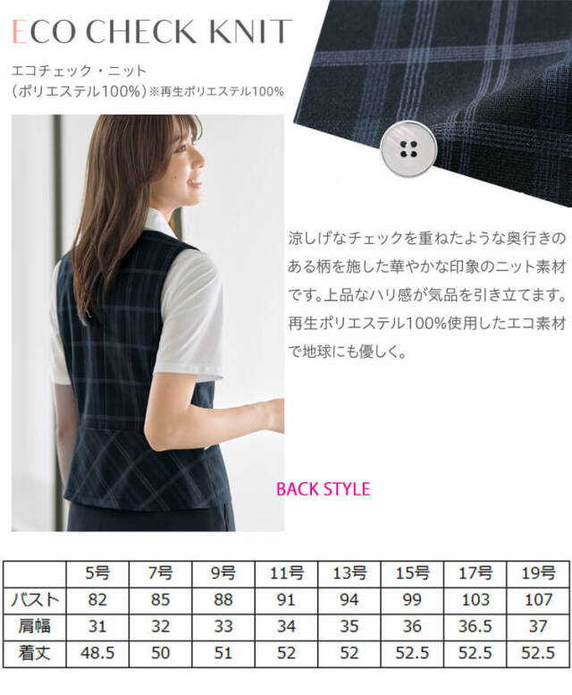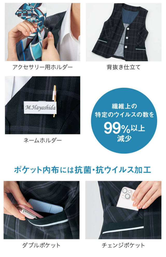 再生ポリエステルを100%使用したベストです。上品なハリ感は気品を引き立てます。衿見返しにアクセサリー用ホルダー、左胸にネームホルダー付きです。腰高効果のあるペプラムデザインや脇腹が細く見えるバイヤス地の目となっています。3つボタンのため簡単に着脱が可能です。ポケット内布に抗ウイルス、抗菌加工(フルテクト)を施し、スマホも入るチェンジポケットです。左腰はダブルポケットです。家庭洗濯が可能です。