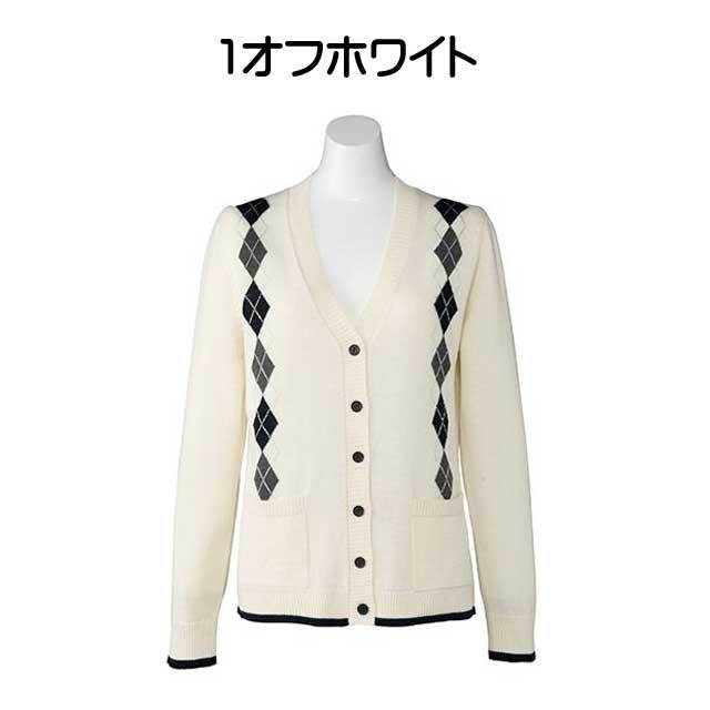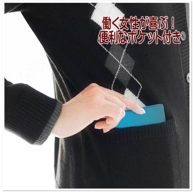 普段のオフィスウェアに可愛いアーガイル柄を取り入れ、オシャレにコーディネイト。柄にラメ糸を使用し、大人っぽい雰囲気にしました。腰まわりをカバーする着丈やポケット付きなどデザインだけでなく、機能面も充実しています。